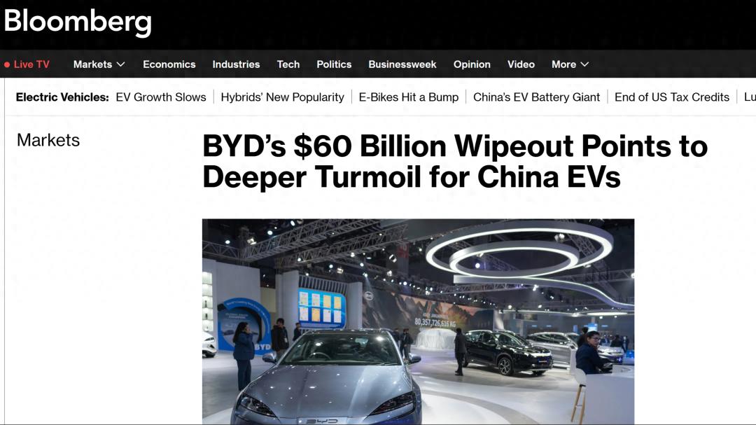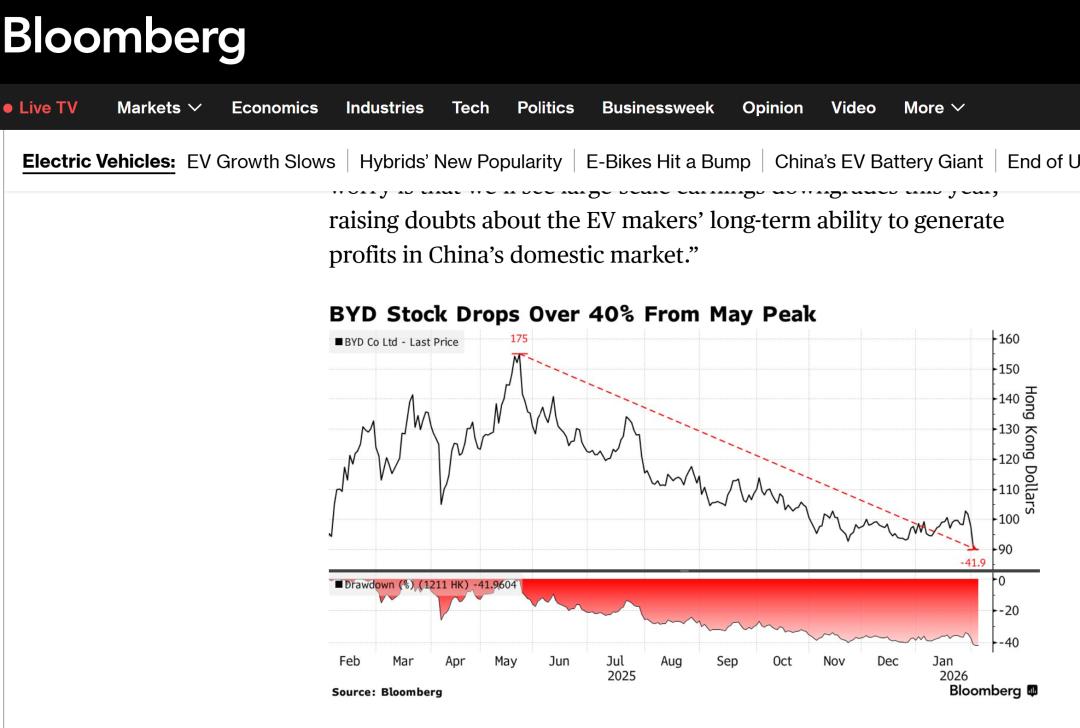 彭博社指出,比亚迪在香港上市的股票本周再度下跌约7%,延续了自去年5月以来的颓势。这场旷日持久的抛售已导致这家行业龙头的市值蒸发超过600亿美元。这一震荡并非孤立事件,它迅速波及整个电动汽车板块,使得本就因税收政策变动和人工智能(AI)商业颠覆担忧而脆弱不堪的股市雪上加霜。