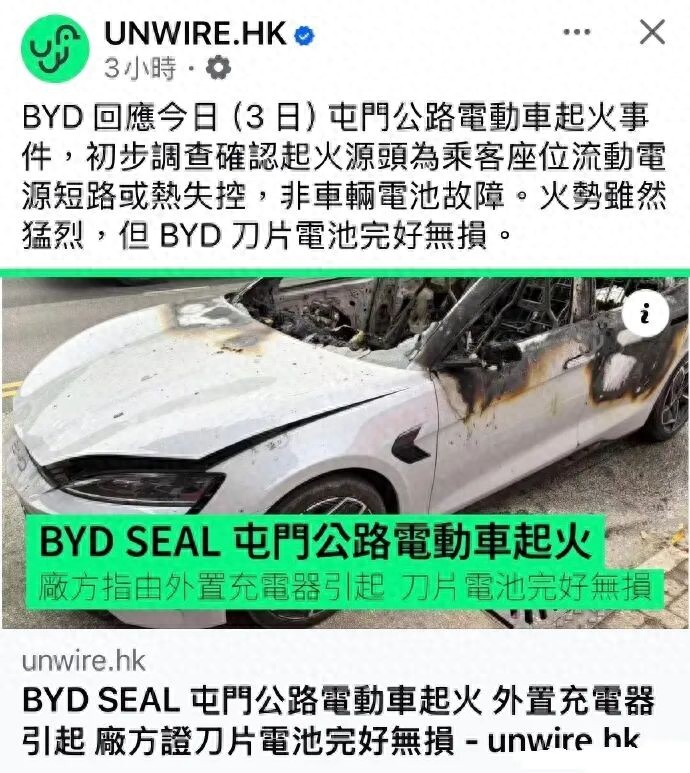 比亚迪迅速站出表示车已送到维修中心,初步调查显示,起火原因是乘客座位上的外置充电器短路或热失控;不是车辆机件的问题,也不是电池故障;核心的刀片电池组件,完好无损。