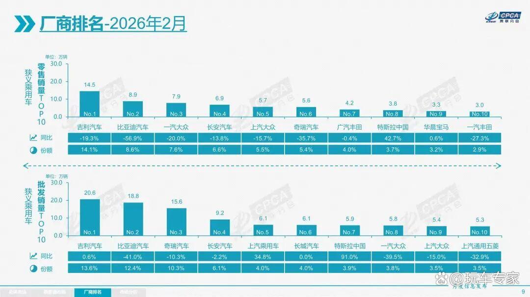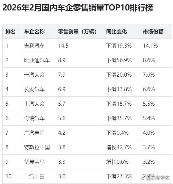 这一格局与当月自主品牌整体表现一致——2月自主品牌零售同比下降30%,市场份额同比下降4.3个百分点,虽在出口市场表现亮眼,但国内零售端仍面临合资品牌的强势挤压,尤其是德系、日系合资品牌凭借稳定的用户基础,守住了核心市场份额。