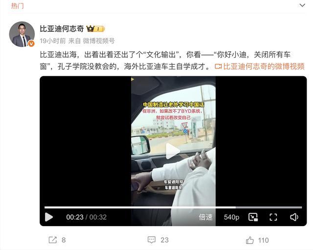 比亚迪作为国内出口量最大的新能源汽车,现在也面临车机系统对海外环境的适应问题。日前,比亚迪副总裁何志奇就发表了一段视频,并配文:比亚迪出海,出着出着还出了个“文化输出”,你看——“你好小迪,关闭所有车窗”,孔子学院没教会的,海外比亚迪车主自学成才。