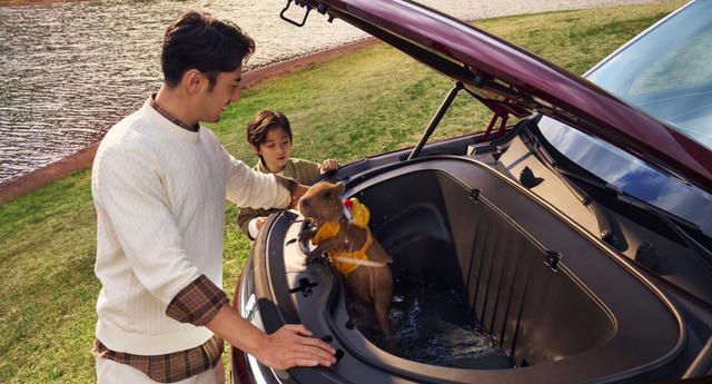 同时,这款车还引入全球最大的252L可水洗电动前备箱,意味着对于很多钓鱼佬和运动爱好者来说,可以在这个前备箱放鱼获,或者放臭袜子、臭鞋,用完之后直接用水清洗就好了,而且大前备箱非常规整,放大尺寸的行李箱也没有问题。