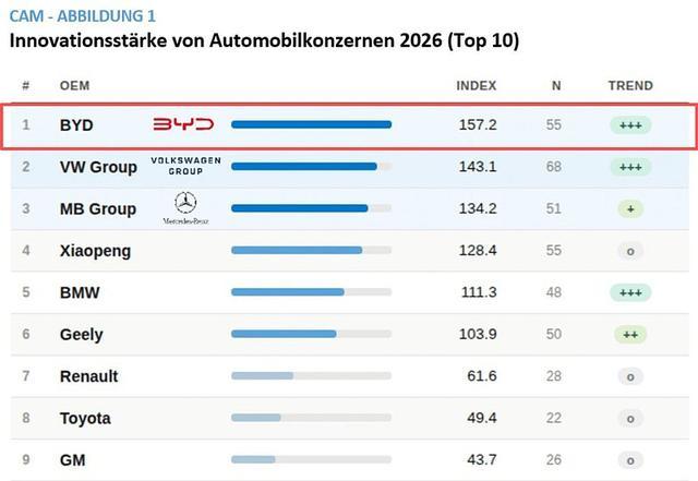 德国汽车管理中心(CAM)于2026年4月21日发布的《2026年汽车创新报告》显示,比亚迪以157.2分首次荣登全球汽车行业创新排行榜榜首,超越去年的冠军大众汽车(143分),国内制造商首次创新榜第一。