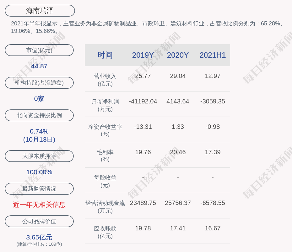 2021年半年报显示,海南瑞泽的主营业务为非金属矿物制品业、市政环卫、建筑材料行业,占营收比例分别为:65.28%、19.06%、15.66%。