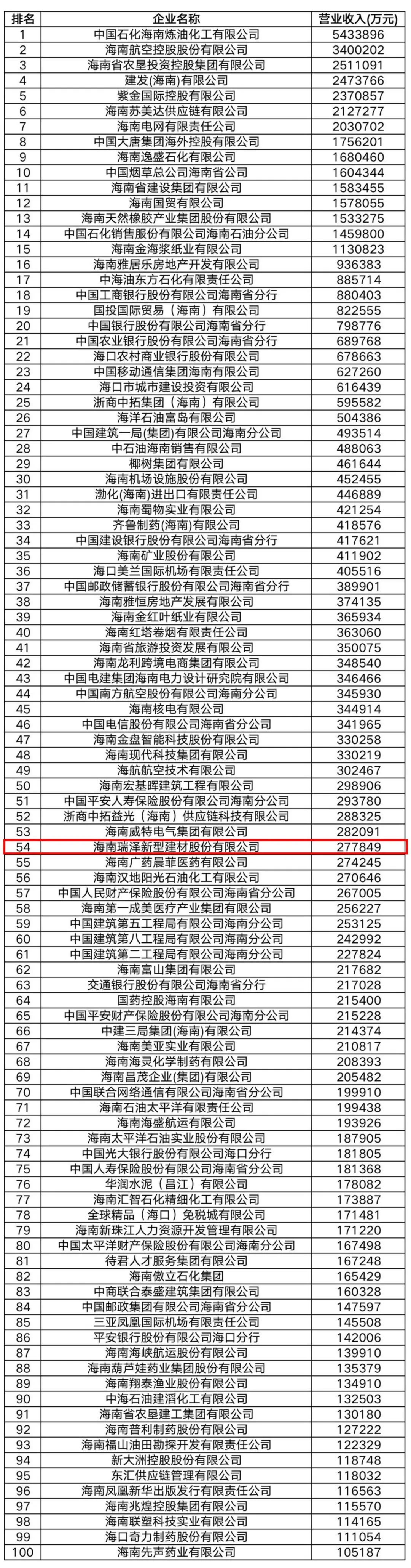 据悉,榜单以海南省企业2021年营业收入为入围标准,排序出2022海南省企业100强。从入围门槛看,2022海南省企业100强入围门槛为营业收入10.52亿元,比上一年度入围门槛7.9亿元大幅提高2.62亿元,增加33%。自海南省2006年开展省企业100强排名以来,海南瑞泽新型建材股份有限公司已连续入围11年。