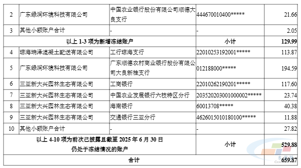 截至2025年6月30日,公司及子公司因涉诉被冻结的银行账户金额共计659.87万元,占公司最近一期经审计净资产的0.88%。上述被冻结银行账户为非主要经营账户,未对公司资金收付和正常的经营活动造成实质性影响。因此上述银行账户被冻结事项不属于《深圳证券交易所股票上市规则》第9.8.1条规定的情形。