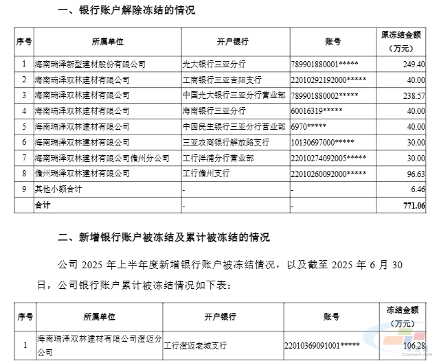 近日,海南瑞泽发布公告,公司查询银行账户获悉公司及子公司名下部分银行账户有解除冻结及新增冻结情况。