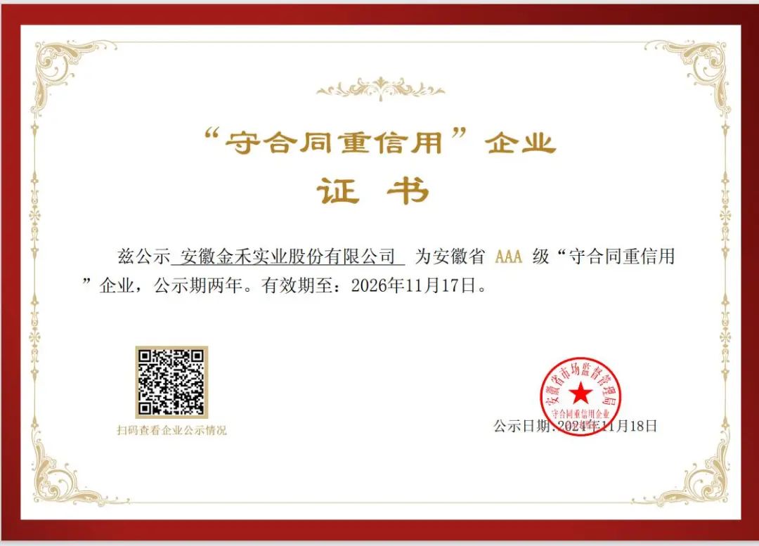 近日,安徽省市场监督管理局公布了安徽省AAA级“守合同重信用”企业名单,安徽金禾实业股份有限公司荣登榜单。