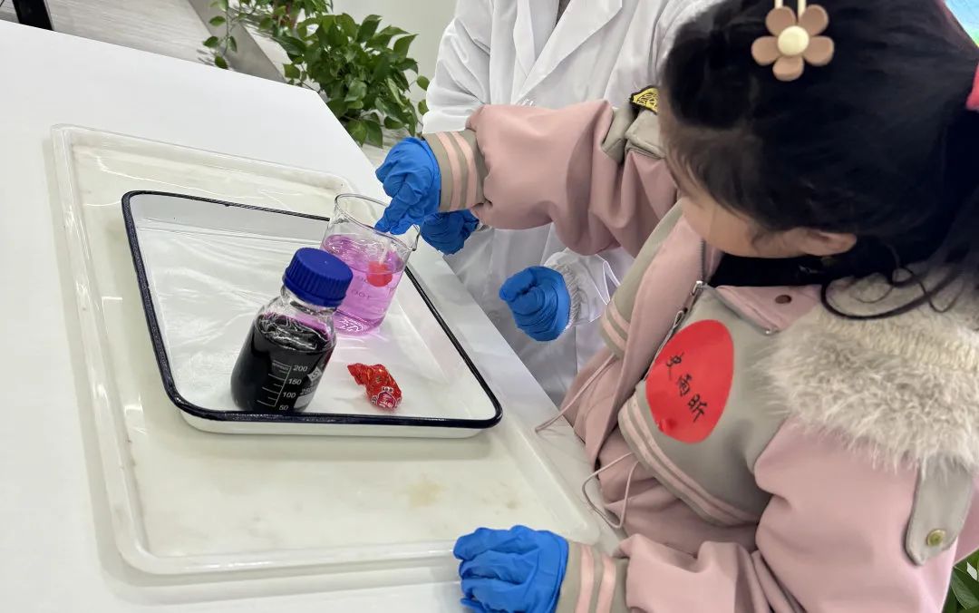 在实验环节,研发中心的姐姐们就像魔法使者,为小朋友们准备了许多神奇的化学小实验。各种奇妙的化学反应不断上演,一会儿是绚丽的色彩变化,一会儿是神奇的物质生成。精彩的实验现象让小朋友们目不暇接,惊叹声此起彼伏,在实验室姐姐们亲切的引导下,小朋友们纷纷开动小脑筋,认真思考这些神奇现象背后的反应原理,科学的“种子”在孩子们心中生根发芽。