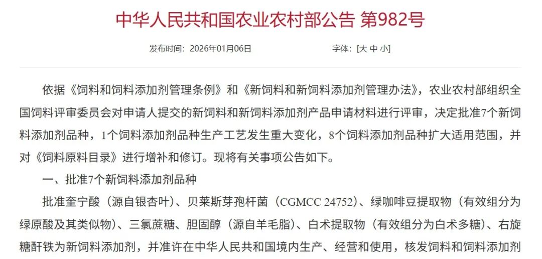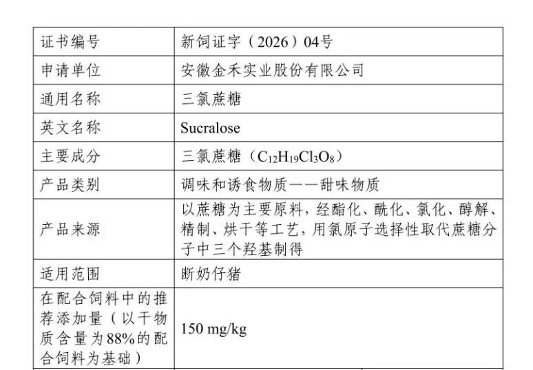 2026年1月6日中华人民共和国农业农村部发布公告第982号文,正式批准7个新饲料添加剂品种,其中安徽金禾实业股份有限公司自主申报的新饲料添加剂——三氯蔗糖(Sucralose)顺利获批,成为金禾实业的首款饲料添加剂产品。三氯蔗糖作为调味和诱食物质(甜味物质类)应用于饲料领域,将为我国饲料行业带来更丰富的甜味剂选择,并进一步推动饲料行业绿色、高效、精准的发展方向。