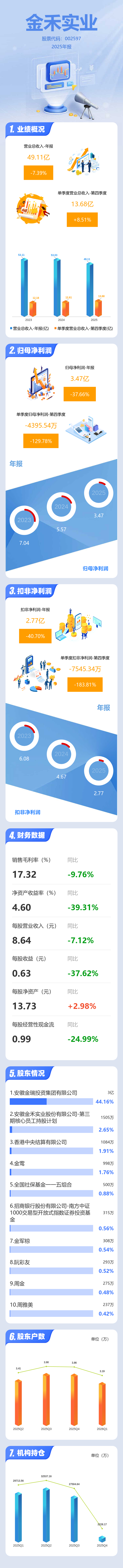金禾实业2025年年报显示,当年度公司主营收入49.11亿元,同比下降7.39%;归母净利润3.47亿元,同比下降37.66%;扣非净利润2.77亿元,同比下降40.7%;其中2025年第四季度,公司单季度主营收入13.68亿元,同比上升8.51%;单季度归母净利润-4395.54万元,同比下降129.79%;单季度扣非净利润-7545.34万元,同比下降183.81%;负债率23.89%,投资收益7067.55万元,财务费用-2187.52万元,毛利率17.32%。