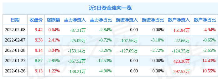 资金流向数据方面,上个交易日主力资金净流出87.31万元,游资资金净流入0.0万元,散户资金净流入151.94万元。近5日资金流向一览见下表: