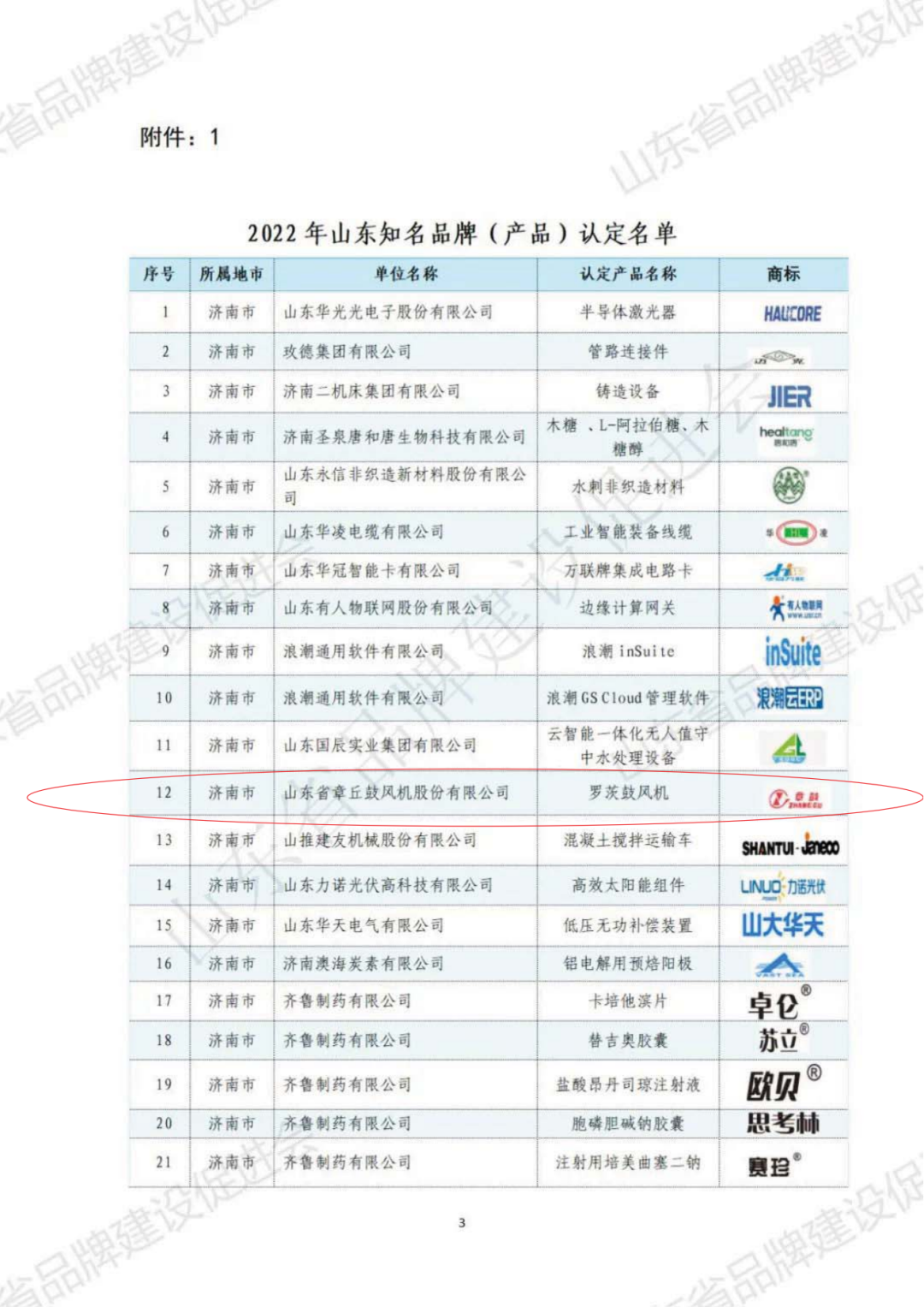 近日,由山东省品牌建设促进会组织开展的2022年度山东省品牌认定工作圆满结束,在本次认定工作中,山东章鼓产品罗茨鼓风机凭借长期的优质服务和良好的品牌口碑成功认定为“2022年山东知名品牌”。