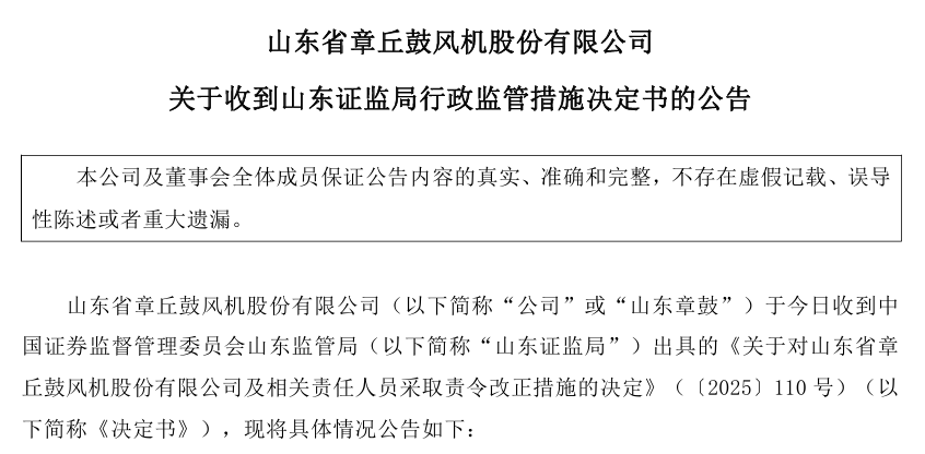 12月19日,因信息披露违规、募集资金使用违规以及公司治理不规范等违规行为,山东省章丘鼓风机股份有限公司(以下简称“山东章鼓”,002598.SZ)公告表示,公司及4名董监高收到由山东证监局下发的《行政监管措施决定书》(以下简称“《决定书》”)。