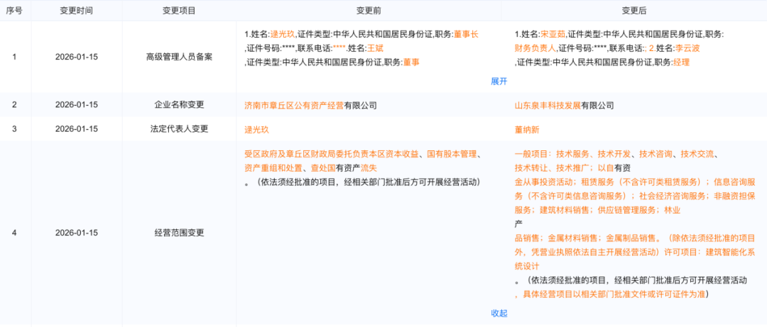 2025年12月29日,章丘控股将其持有的泉汇产发20%股权无偿划转至济南山韵产业集团有限公司、山东泉韵置业有限公司。12月30日,章丘控股全资子公司山东省晖诚商贸有限公司、济南市章丘区惠鑫资产运营有限公司(下称“惠鑫资产”)注册成立。