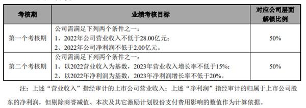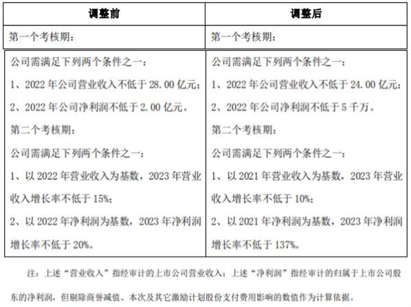 从第二个考核期两个条件的调整情况看,与第一个考核期的条件颇为不同。其中,营业收入指标调整为以2021年营收24.05亿元为基数的增长率不低于10%,由于基数已经确定,具体金额可以确定为不低于26.46亿元,仍低于调整前的2022年“不低于28亿元”的考核目标。