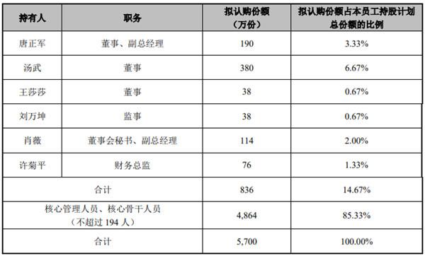 其中,董事汤武拟认购380万份,在该持股计划中所占比例最高;董事、副总经理唐正军认购190万份,董秘、副总经理肖薇认购114万份,均是认购份额超过百万的两位高管。另外,核心管理人员、核心骨干人员拟认购份额4864万份,占85.33%。