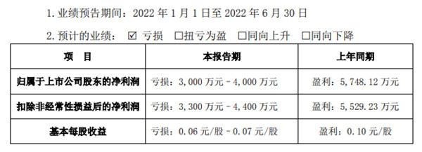 根据7月上旬盛通股份披露的2022年半年度业绩预告,公司预计业绩由上年同期盈利转为本期的亏损,其中,归属于上市公司股东的净利润为亏损3千万元至4千万元之间,而上年同期为盈利超过5700万元。