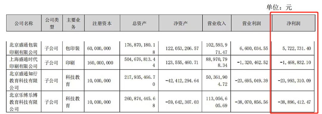 净利润方面,上半年除了北京盛通包装印刷带来净利润572.27万元,上海盛通时代印刷、北京盛通知行教育、乐博乐博均出现了亏损。尤其是科技教育板块的两家子公司期内合计亏损6289万元,对净利润造成了较大的不利影响。而唯一实现正向盈利的北京盛通印刷,也不能说十分乐观。去年,北京盛通印刷全年实现净利润1896.64万元,同比大涨161.13%。而今年三个季度不到600万元,两相比较,子公司要达到去年的利润水平或有较大的难度。