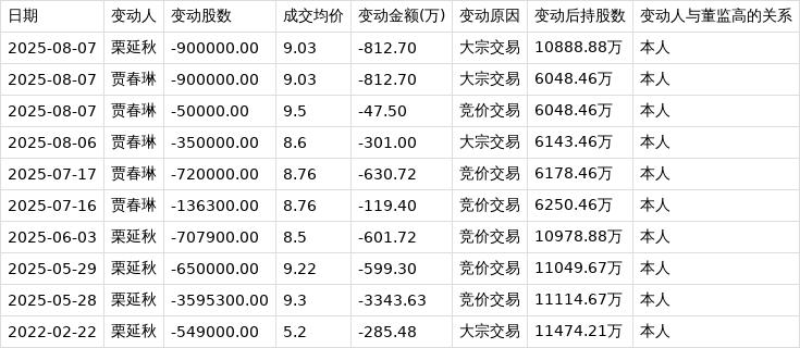 深交所公开信息显示,8月7日,盛通股份董事贾春琳在竞价交易公司股票,减持股数5.00万股,成交均价9.50元,变动金额47.50万元,变动后持股数为6048.46万股。