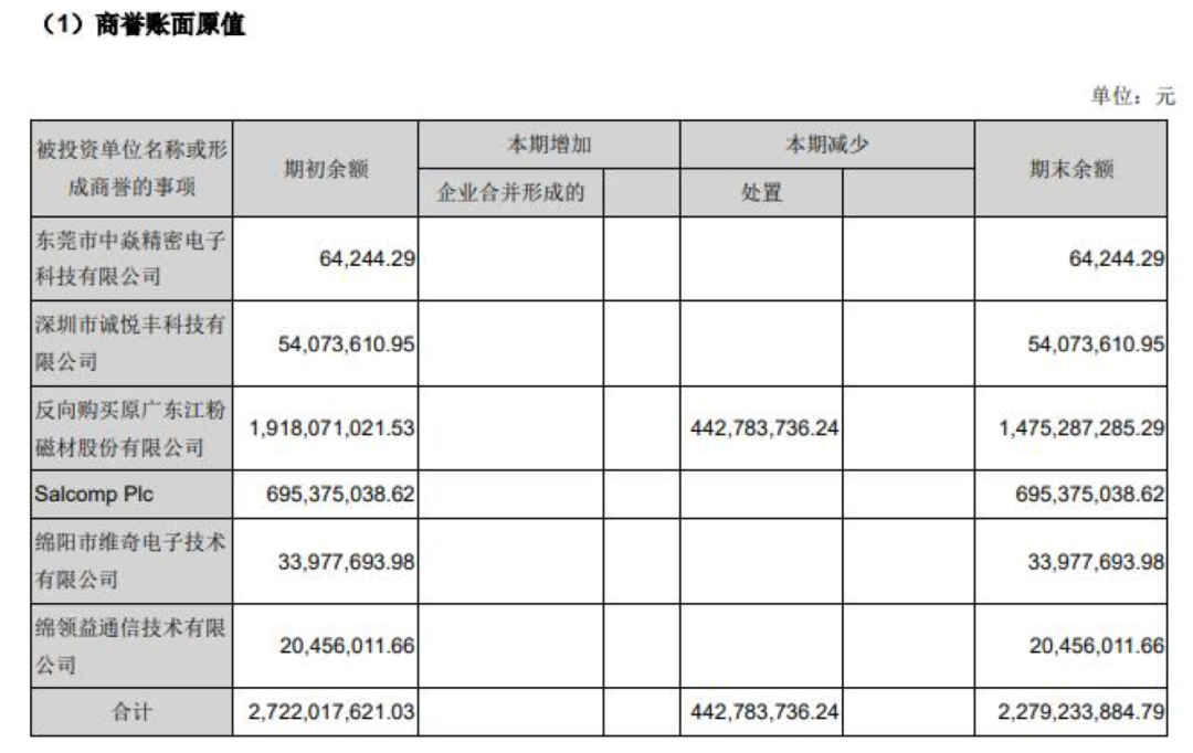 频繁的并购也使领益智造变为了高商誉公司,而且是新老商誉叠加。此前领益智造为借壳上市反向收购江粉磁材带来9.5亿商誉,2017年收购东方亮彩形成12.47亿商誉,2019年收购芬兰公司赛尔康形成7亿商誉。2020年年报显示,领益智造减值准备前商誉达到27.22亿元。