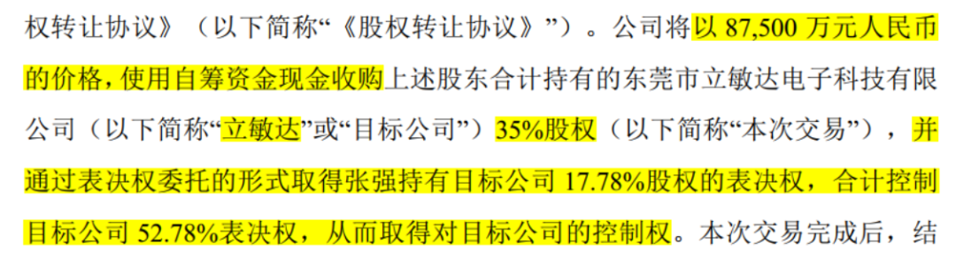 2025年12月23日,领益智造披露,拟以8.75亿元现金收购立敏达35%股权,并通过表决权委托取得其17.78%股权对应的表决权。
