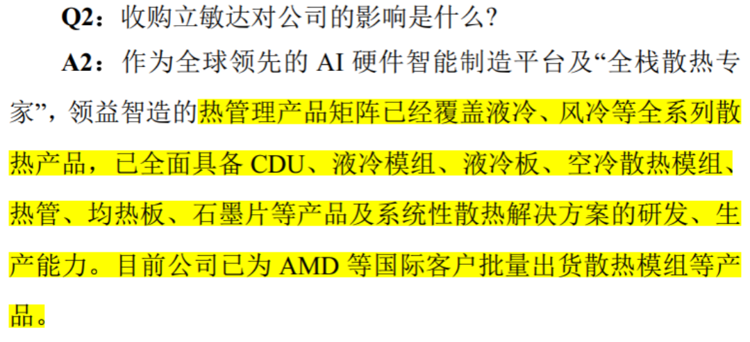 目前,公司在热管理方面已经有了一些积累,产品矩阵覆盖液冷、风冷等全系列散热产品,并为AMD等国际客户批量供货。