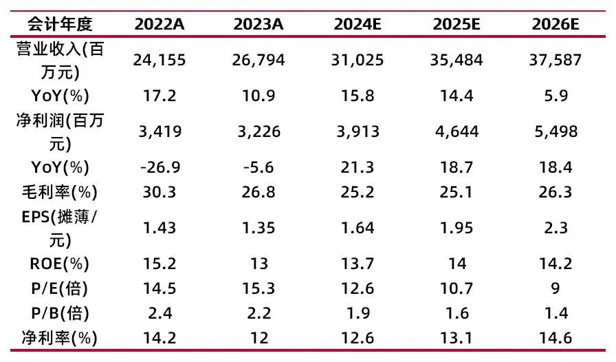 公司发布2023年年报和2024年一季报,23年实现营收267.65亿元,同比+11%;归母净利32.26亿元,同比-5.64%。24Q1实现营业收入72.88亿元,同比+4.52%,环比+11.93%;归母净利润9.51亿元,同比+64.15%,环比-12.27%。