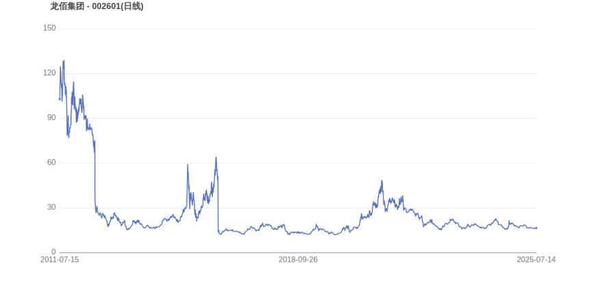 从上市首日至今,龙佰集团的市值实现了3.07倍的增长,显示出较强的成长性。2021年2月18日,龙佰集团的市值巅峰达到1050.15亿元,股价也顺应升至51.68元。而至7月14日收盘,龙佰集团的股价为16.47元,市值为393.02亿元,相比峰值时期市值减少657.13亿元,市值蒸发了62.57%。