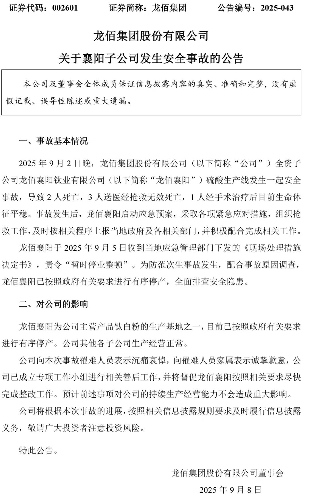 根据公告,事故发生后,龙佰襄阳启动应急预案,采取各项紧急应对措施,组织抢救工作,及时按相关程序上报当地政府及各相关部门,并积极配合完成相关工作。龙佰襄阳于2025年9月5日收到当地应急管理部门下发的《现场处理措施决定书》,责令“暂时停业整顿”。为防范次生事故发生,配合事故原因调查,龙佰襄阳已按照政府有关要求进行有序停产,全面排查安全隐患。