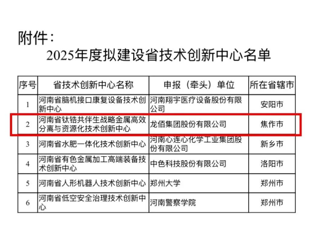 近日,省科技厅《关于2025年度拟建设河南省技术创新中心的公示》名单中,龙佰集团的“河南省钛锆共伴生战略金属高效分离与资源化技术创新中心”榜上有名,成为本年度我市唯一获批建设该省级创新平台的企业,实现中站区“零突破”。