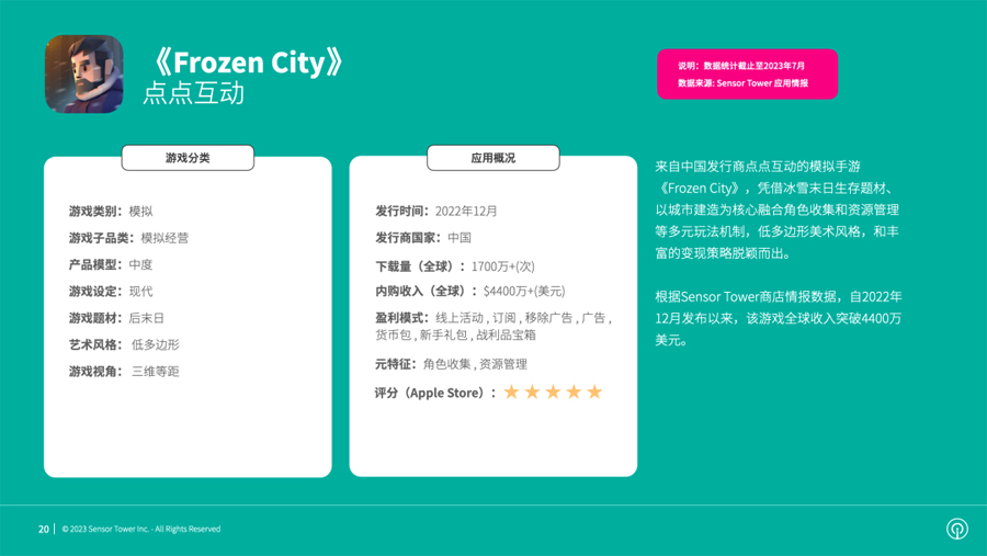据第三方机构Sensor Tower统计,自2022年12月发布以来,《冰封时代》(Frozen City)凭借冰雪末日生存题材、多元玩法机制,以及低多边形美术风格获得了众多海外玩家的青睐。该作不仅进入了全球40多个国家及地区的免费榜Top10,还在今年2月登顶了全球模拟手游收入增长榜首。而另一款《寒霜启示录》(Whiteout Survival)更是表现惊人,上线后下载量快速突破百万,并刷新了世纪华通自研产品收入纪录。而在Sensor Tower前不久发布的报告《2023年全球热门手游题材市场洞察》显示,从2023年1-7月,《寒霜启示录》(Whiteout Survival)累计收入位列末日题材出海手游收入榜第5,并始终位于末日题材手游增长榜第一。这两款游戏的快速增长,不但让点点互动自研游戏收入增长超50%,也使其在中国手游发行商全球收入排行榜中的排名从年初的第18名一路上升到了现在的第7名。