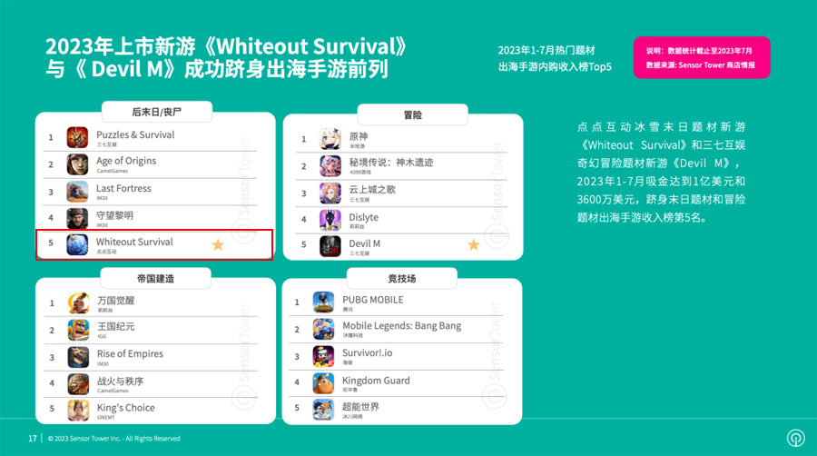 《寒霜启示录》(Whiteout Survival)位于2023年1-7月热门题材收入榜第5