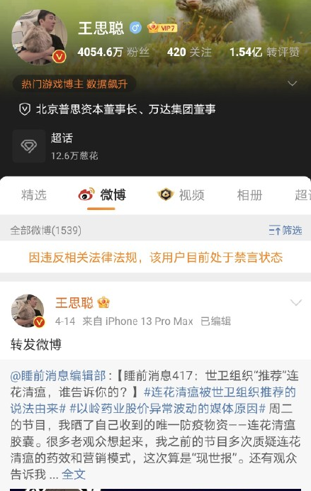 翻看王思聪微博,其最新一条发言停留在4月14日。页面显示,王思聪转发了一条“睡前编辑部”的视频。该转发视频题为“世卫组织“推荐”连花清瘟,谁告诉你的?”,该号主称自己“多次质疑连花清瘟的药效和营销模式”。