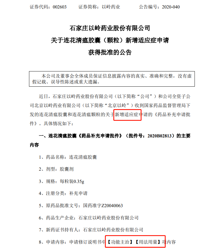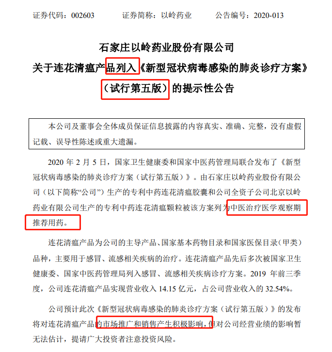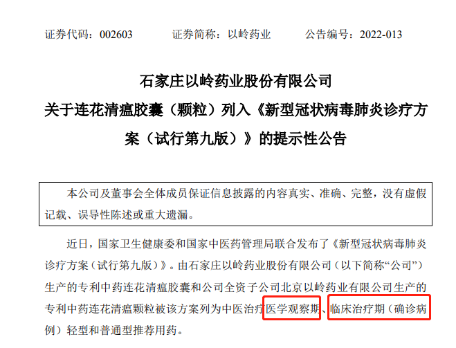 2020年1月27日(正月初三),国家卫健委和国家中医药管理局联合发布的《新型冠状病毒感染的肺炎诊疗方案(试行第四版)》,其中首次把以岭药业的产品“连花清瘟”列为中医治疗医学观察期推荐用药。