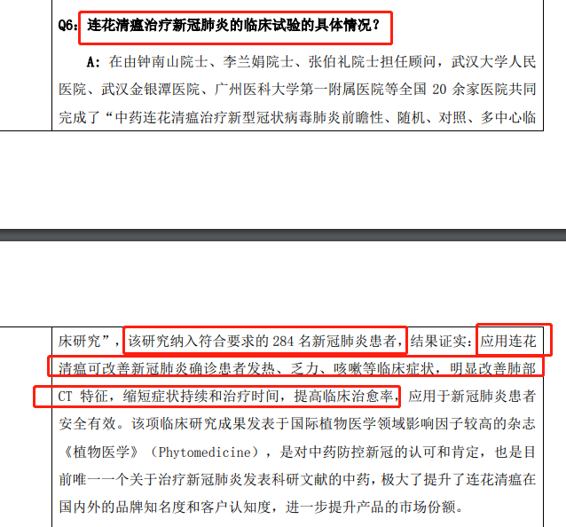因为还处于春节假期,公司也无法立即有所动作。2020年2月3日(正月初十)开盘,公司就迎来了涨停。当天,法定复工第一天,公司就开展了开年第一次机构交流会,传递关键词:连花清瘟缺货、在配合临床试验,并顺带把1月27日被列为观察期推荐用药说了一下。