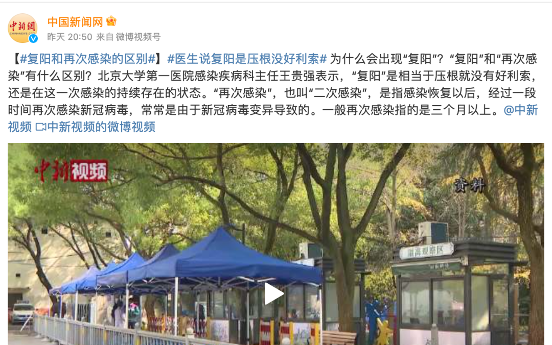 12月21日,@中国新闻网消息,为什么会出现“复阳”?“复阳”和“再次感染”有什么区别?北京大学第一医院感染疾病科主任王贵强表示,“复阳”是相当于压根就没有好利索,还是在这一次感染的持续存在的状态。“再次感染”,也叫“二次感染”,是指感染恢复以后,经过一段时间再次感染新冠病毒,常常是由于新冠病毒变异导致的。一般再次感染指的是三个月以上。