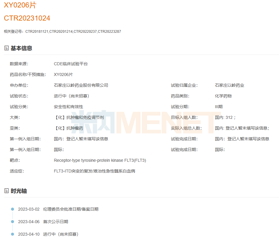 此次,该产品Ⅲ期临床研究的目的是确证XY0206片治疗FLT3-ITD突变的复发/难治性急性髓系白血病的有效性和安全性。