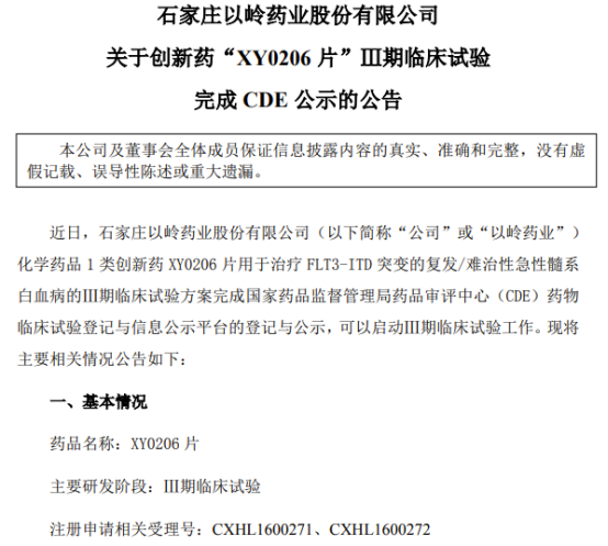 据了解,XY0206项目先后在中国晚期/转移恶性实体瘤患者中以及复发/难治急性髓系白血病患者中开展对该产品的安全性和耐受性、药代动力学特征、初步疗效的I期研究,并完成伊曲康唑胶囊与XY0206片的药物相互作用及饮食对XY0206片影响的两项临床研究。