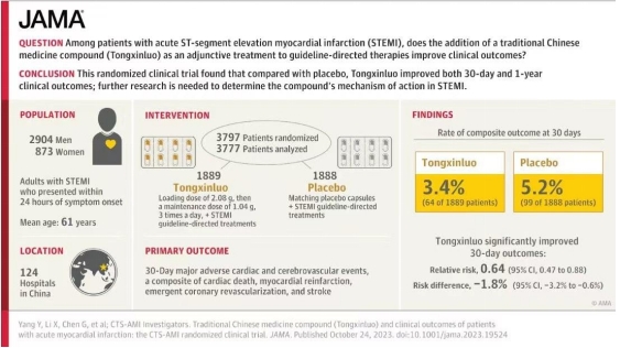 今年10月,由中国医学科学院阜外医院杨跃进教授牵头、全国124家医院参与的国家重点研发计划“脉络学说营卫理论指导系统干预心血管事件链研究”子课题“中国通心络治疗急性心肌梗死心肌保护研究”成果,在全球四大顶级医学期刊之一的《美国医学会杂志(JAMA)》(影响因子120.7分)上重磅发表。结果证实,以岭药业的专利中药通心络胶囊可以显著降低急性心梗患者死亡风险和心梗复发风险。国内外专家学者指出,作为我国首个刊登在国际医学顶刊的中成药循证研究,该成果具有里程碑意义,为中西医结合治疗临床重大疾病找到了结合点,有力地推动了中医药现代化、国际化进程。