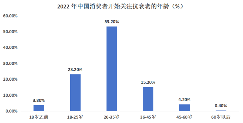 作为消费主体的“z世代”青年同样对预防衰老这一话题保持高度敏感,据艾媒咨询统计,2022年我国消费者开始关注抗衰老的年龄段集中在26-35岁,占比高达53.2%,整体市场呈现年轻化趋势,潜在用户充足。