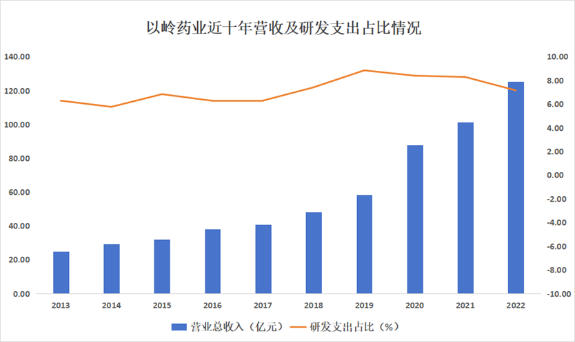 追本溯源,从公司历年的年报数据可以发现,以岭药业能够在各个领域取得成功并非偶然。近十年来,在公司营收保持高速增长的同时,研发支出占比也始终维持高位,远超行业平均水平。