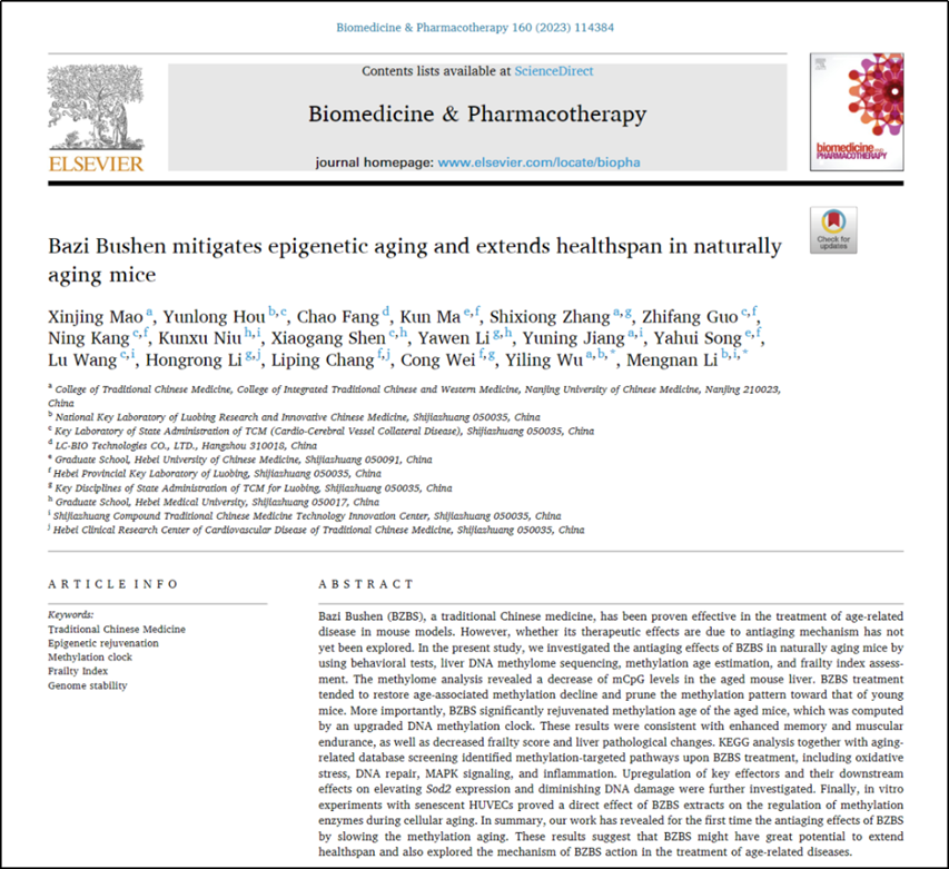 事实上,早在今年6月,以岭药业八子补肾胶囊通过逆转DNA甲基化抗衰老的功效已在科学实验中得到验证,相关学术论文《八子补肾延缓自然衰老小鼠表观遗传衰老并延长其健康寿命》也发表在国际药学领域SCI期刊《生物医学与药物治疗》(Biomedicine Pharmacotherapy,影响因子7.419)上。