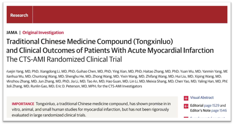 “中国通心络治疗急性心肌梗死的临床疗效——CTS-AMI随机临床研究”发表于顶级医学期刊JAMA