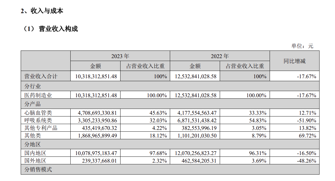 正如以岭药业自身在年报中解释的那样,业绩下滑系受呼吸类产品因2022年高基数及社会库存高企导致的市场需求下降等因素影响。翻看以岭药业2023年中报,可以发现呼吸系统类产品销售额为30.88亿,在这份年报里该项销售额为33.05亿。也就是说,去年下半年呼吸系统类产品总体销售额只有2.17亿,滑坡惊人。