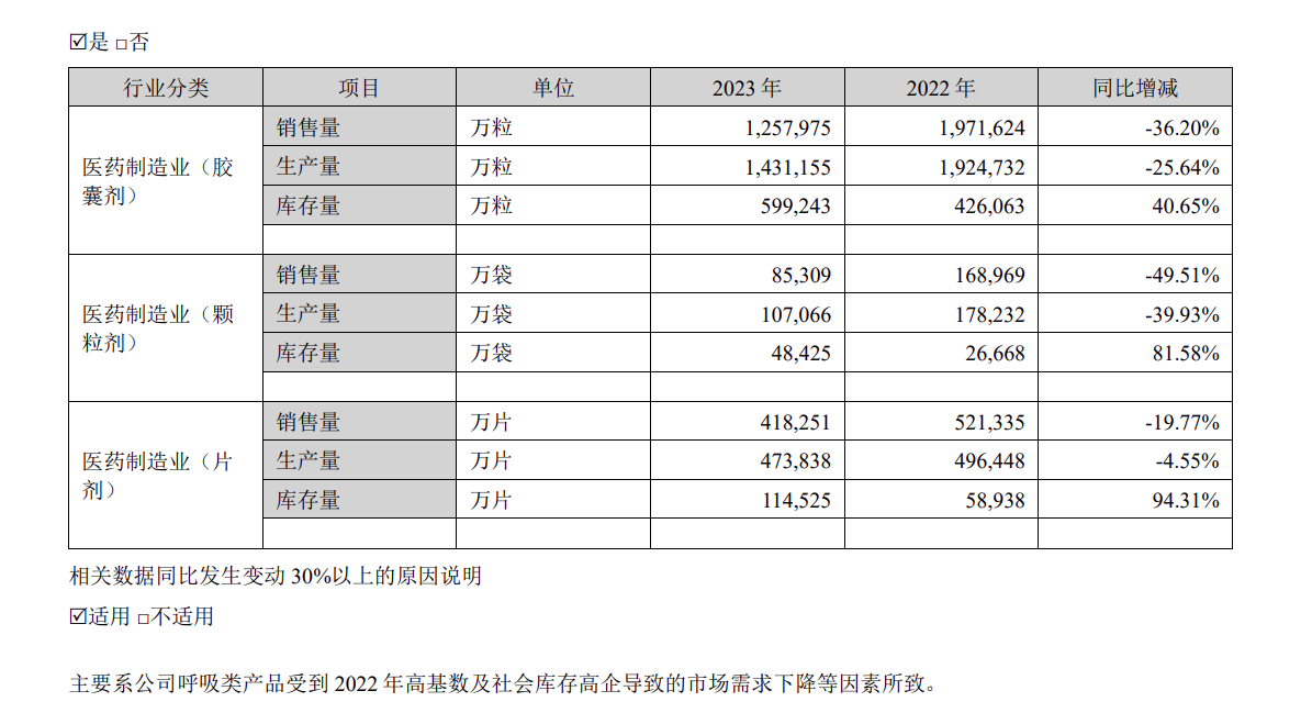 至于相关数据同比发生变动30%以上的原因,以岭药业称“主要系公司呼吸类产品受到2022年高基数及社会库存高企导致的市场需求下降等因素所致。”