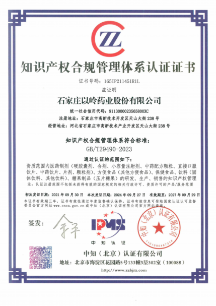近日,石家庄以岭药业股份有限公司(以下简称“以岭药业”)通过《企业知识产权合规管理体系要求》国家标准认证,并获得知识产权合规管理体系认证证书。