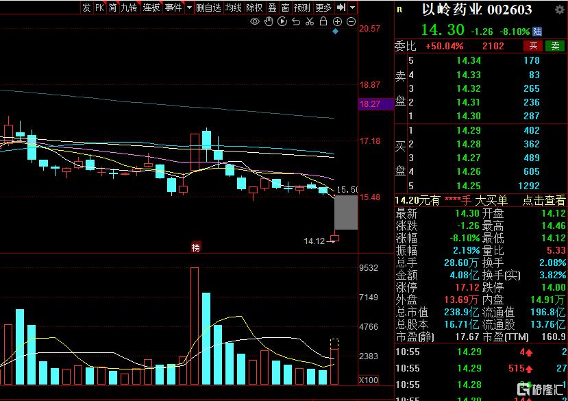 消息影响下,截至发稿,以岭药业跌超8%,报14.3元/股,总市值238.9亿元。