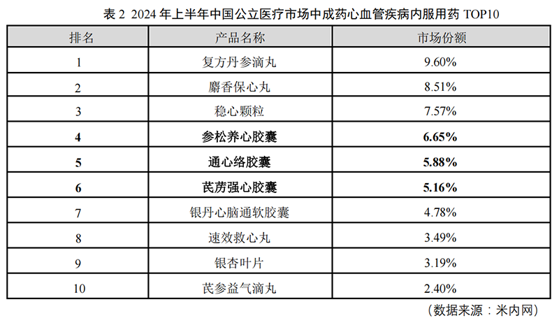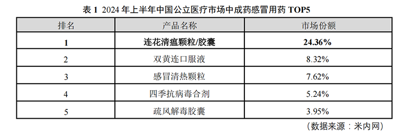 从产品市场表现来看,公司的感冒呼吸系统疾病产品和心脑血管疾病产品优势显著。据米内网数据统计,以岭药业生产的连花清瘟颗粒/胶囊在2024年上半年中国公立医疗市场中成药感冒用药 TOP5中排名第一,市场份额达24.36%。参松养心胶囊、通心络胶囊和芪苈强心胶囊三大创新专利中药市场份额,由2015年的13.64%提升至2024年上半年的17.69%,分别位列TOP4、5、6。