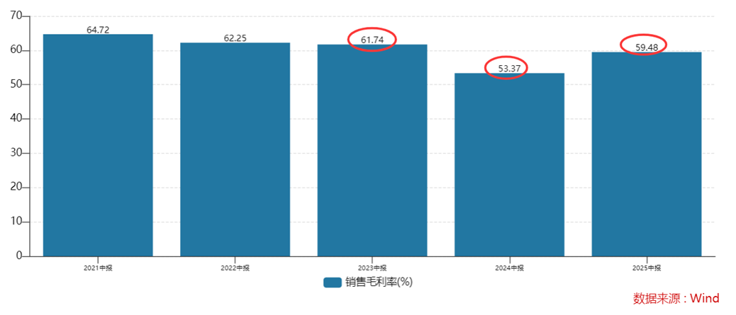 而毛利的变化更为直观。近三期半年报显示,公司销售毛利率分别为61.74%、53.37%、59.48%,同比变动分别为-0.82%、-13.56%、11.45%。2025年上半年,虽然毛利率出现同比增长,但深入分析发现,这种改善主要来自于公司压缩成本和处理库存产品带来的短期效应,而非真正的产品竞争力提升或定价能力增强。