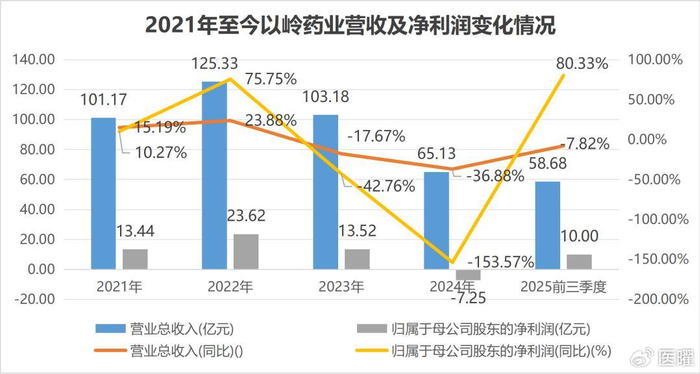 2022年,以岭药业营收触及125.33亿元的历史峰值,但2023年便调头向下,营收降至103.18亿元,同比下滑17.67%;2024年形势进一步恶化,营收直接腰斩至65.13亿元,同比跌幅扩大至36.88%,更出现7.25亿元的归母净利润亏损——这是公司上市以来的首次年度亏损。